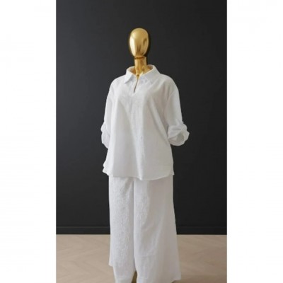 Women's Relaxed Textured Two-piece Set – Long Sleeve Shirt & Wide-leg Pants - White