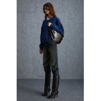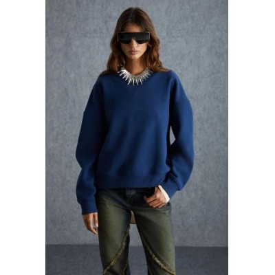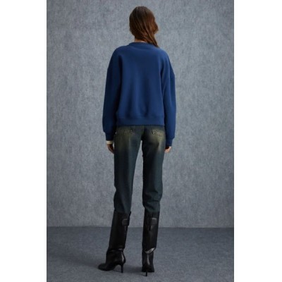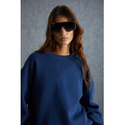 Grimelange Vaneltina Women's Polar Fleece 3 Thread Organic Cotton Oversize Basic Crew Neck Navy Blue Sweatshirt